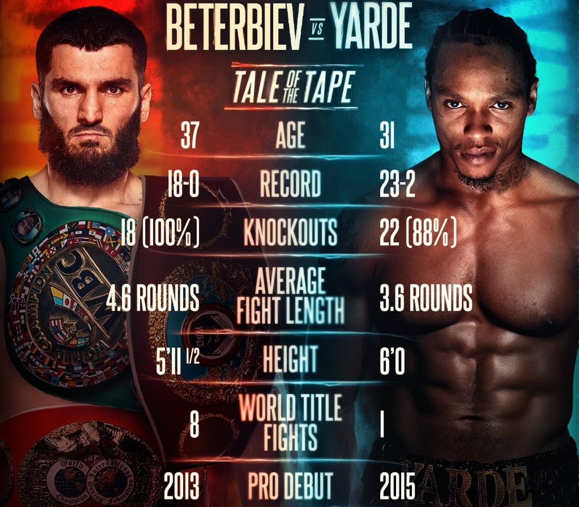 Tot el pornește favorit și acum, provocarea constând în faptul că adversarul său nu a fost învins niciodată înainte de limită. Smith are o singură înfrângere, la puncte, în fața lui Canelo Alvarez după 12 reprize în care a rezistat eroic asalturilor mexicanului, nepunând însă mari probleme în atac. Beterbiev va miza pe stilul binecunoscut de tăvălug, călcându-l pe englez atâta timp cât va dura meciul și căutând loviturile tari cărora le-au picat victime toți cei care s-au încumetat să-l provoace.