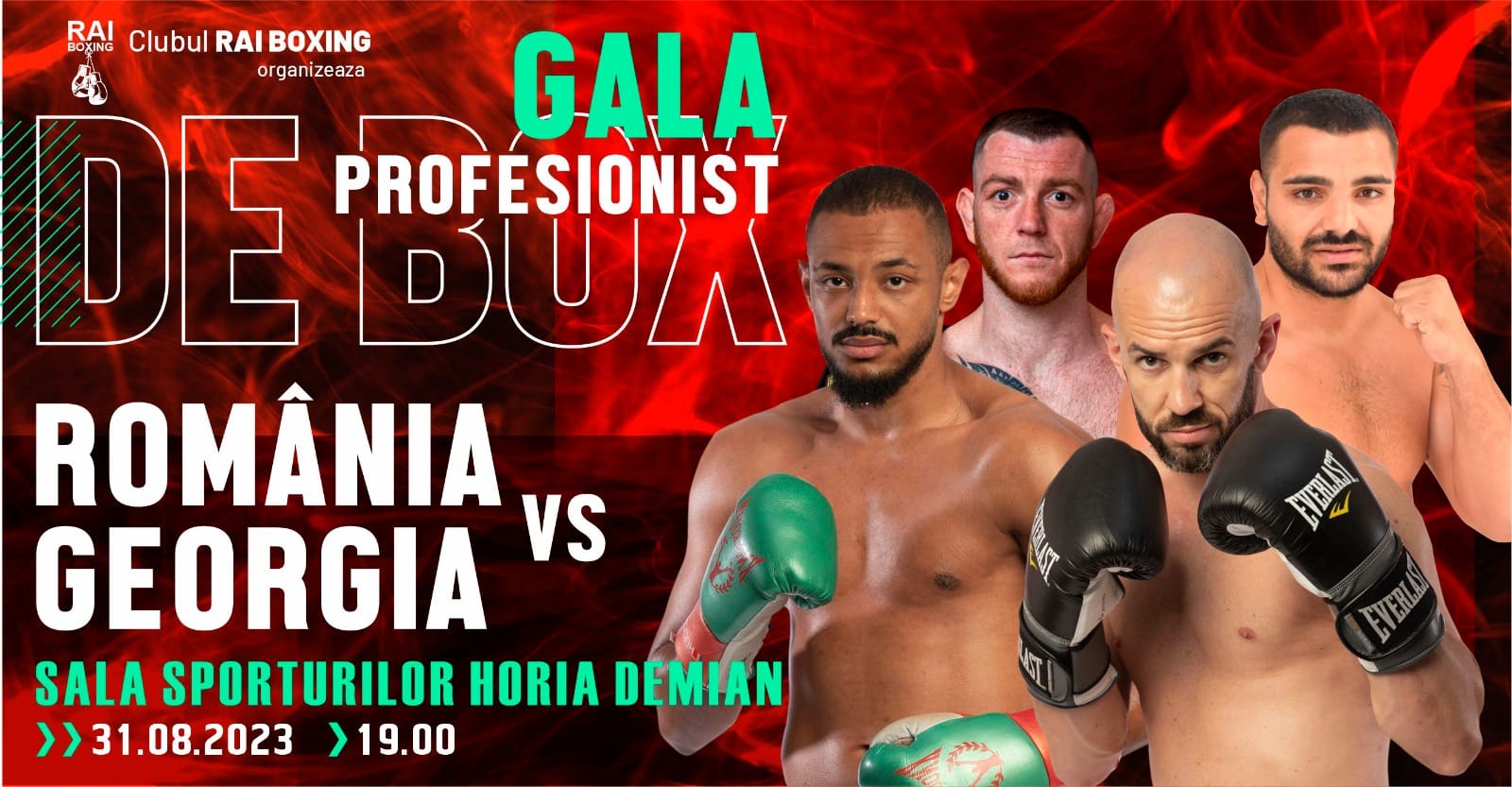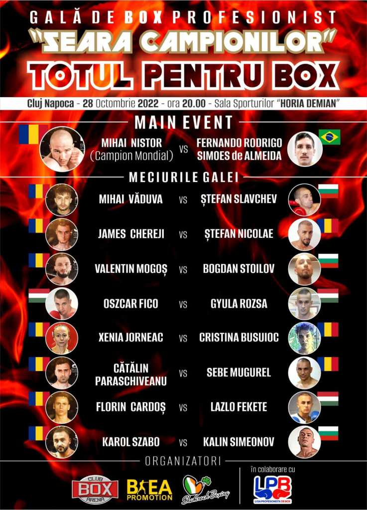 Joi 31 august, cu începere de la orele 19, în Sala Sporturilor Horia Demian din Cluj-Napoca va avea loc o gală de box profesionist în care Nicu Chiorean, Tamer Mahgoub, Ion Mihai Desrobitu și Bogdan George Barbu vor da piept cu adversari din Georgia, după cum urmează: