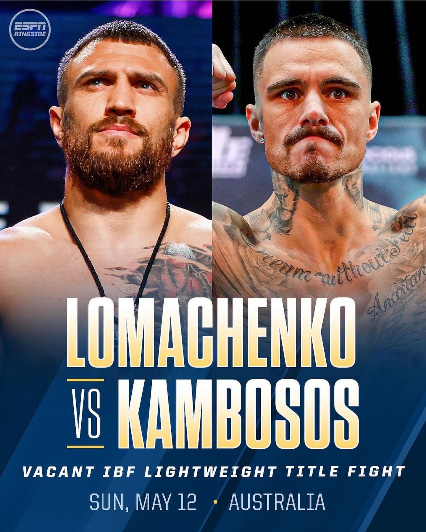 Conform lui Mike Coppinger de la ESPN, Vasyl Lomachenko și George Kambosos se vor lupta pentru centura IBF a categoriei lightweight (61.2 kg) pe data de 12 mai în Perth, Australia.